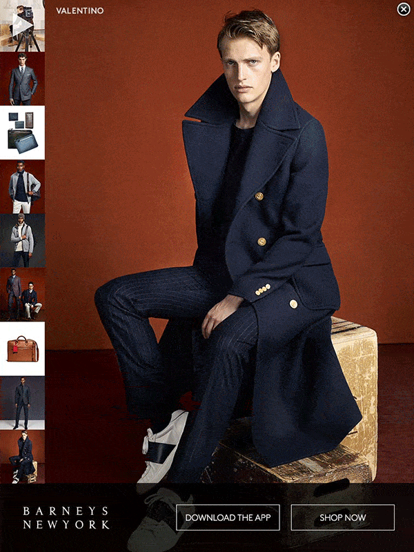 Barneys New York partnered with Valentino to promote their latest menswear collection through an innovative iPad advertising experience. The luxury retailer needed an immersive, interactive ad unit that would showcase the collection's sophistication, drive app downloads, and facilitate direct shopping while maintaining the elevated aesthetic both brands are known for.