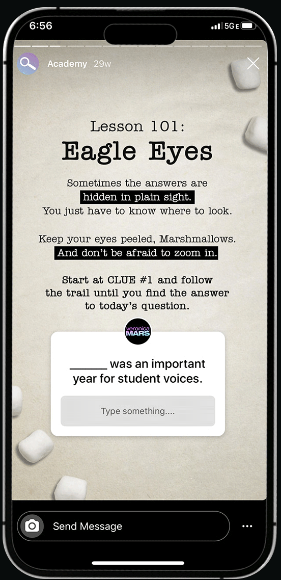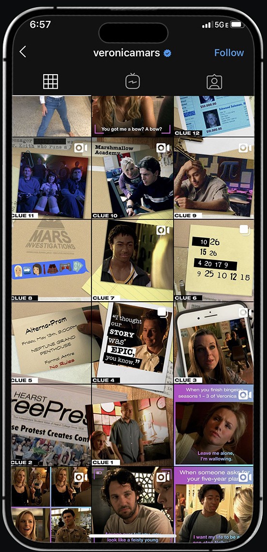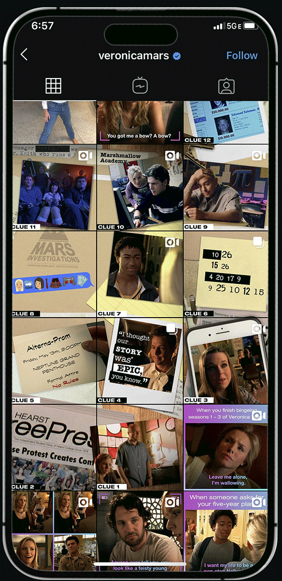 Designed a daily clue hunt within the official Veronica Mars Instagram grid, where followers pieced together answers by exploring hidden details across posts.
