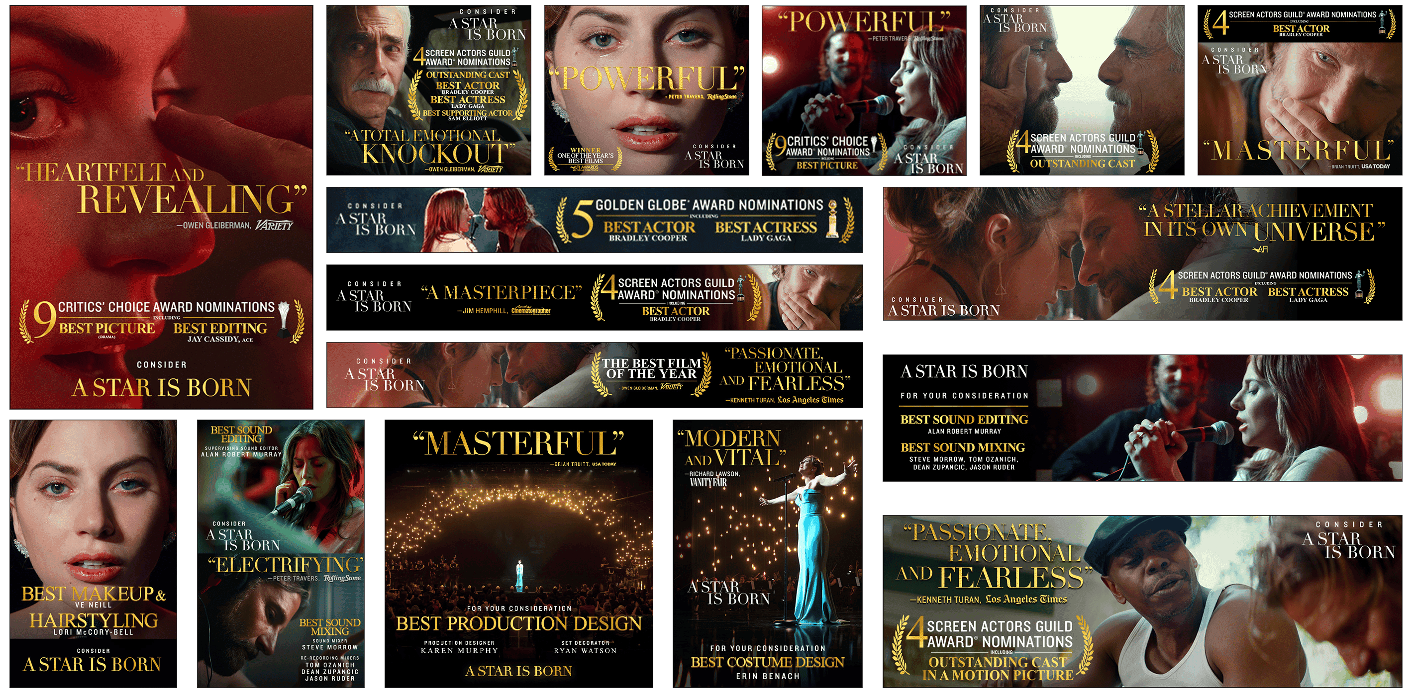 Warner Bros. needed a comprehensive For Your Consideration (FYC) campaign for "A Star Is Born" targeting Academy voters and awards guilds across all major categories. The campaign required a sophisticated visual system that could highlight the film's numerous accolades, showcase different technical achievements, and maintain premium quality across dozens of trade advertisements, digital placements, and screening materials throughout the competitive awards season.