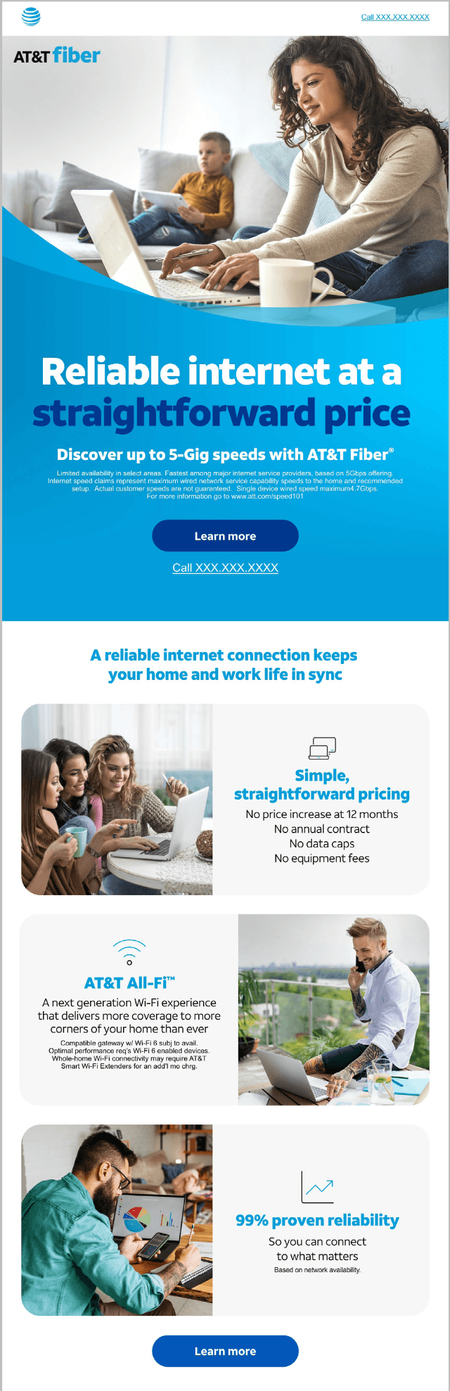 Deliver a wide-ranging suite of digital assets for AT&T's wireless and fiber products, including email, CRM, and streaming platform placements. The objective was to drive conversions through clear, engaging messaging across complex segmented offers, while introducing motion-driven “pause” ads for in-stream viewers.