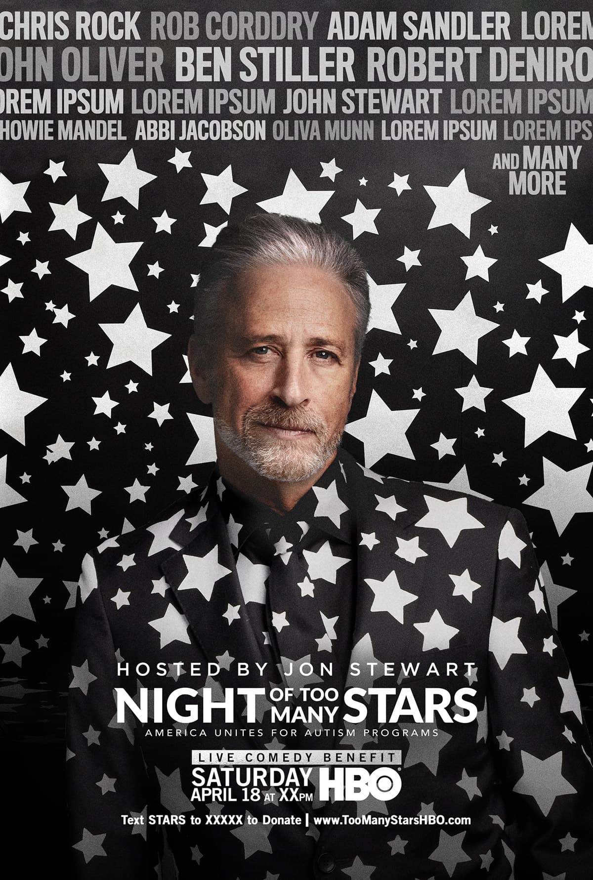 HBO and Comedy Central were producing "Night of Too Many Stars," a star-studded live comedy benefit hosted by Jon Stewart to raise funds for autism programs. The event needed a cohesive visual identity that could work across promotional materials, accommodate dozens of celebrity names, and convey both the entertainment value and charitable mission of the event.